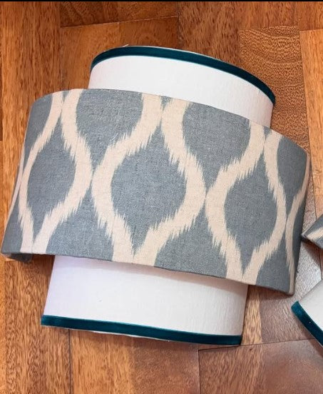 Aplique de pared doble con tela geométrica azul, lino blanco y terciopelo.