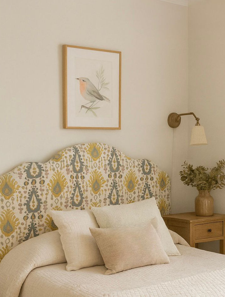 Cabecero en tela ikat Bali mostaza con o sin ribete.