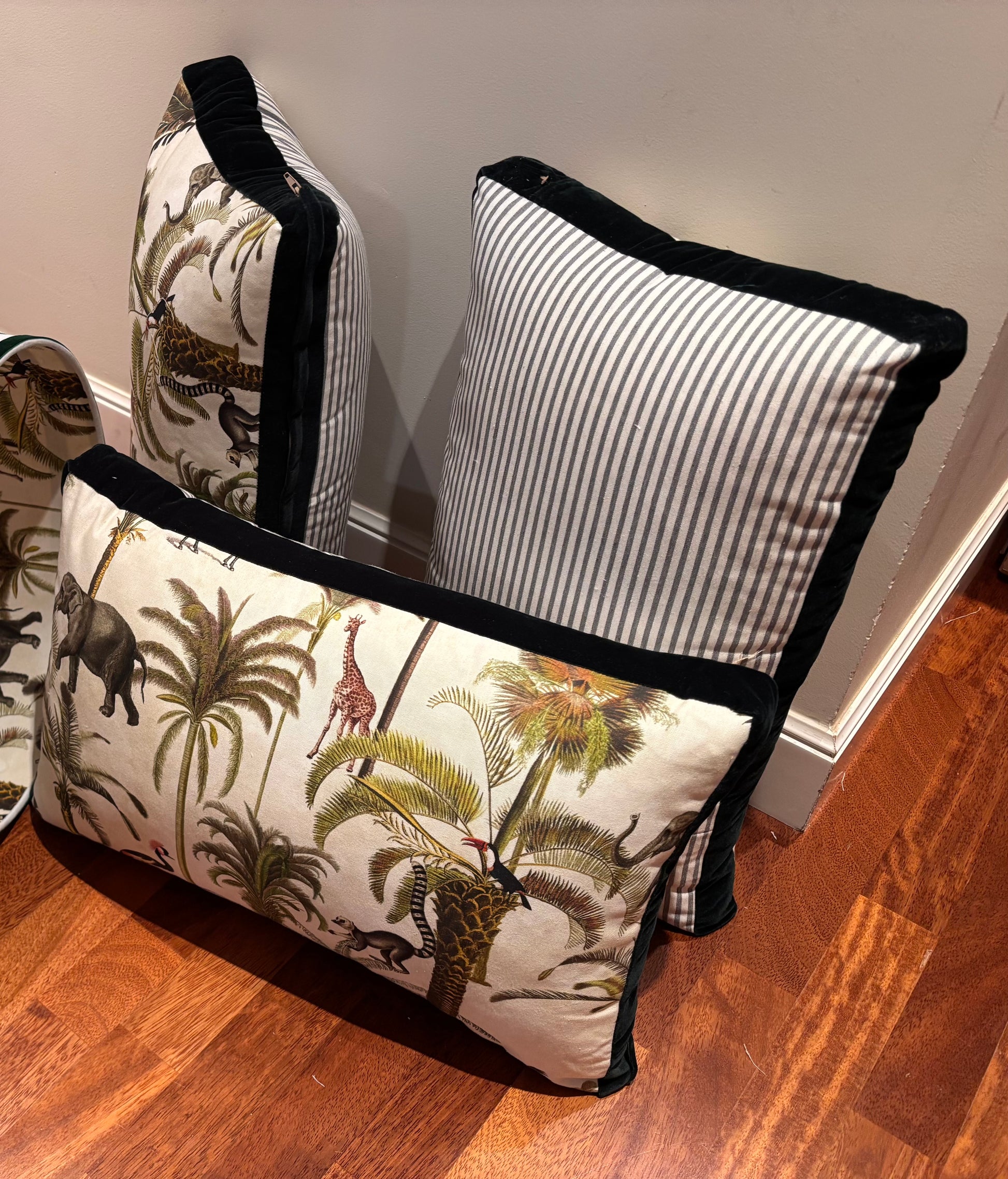 Cojines con canto de 5cm de terciopelo verde, un lado tela selva y otro rayas.