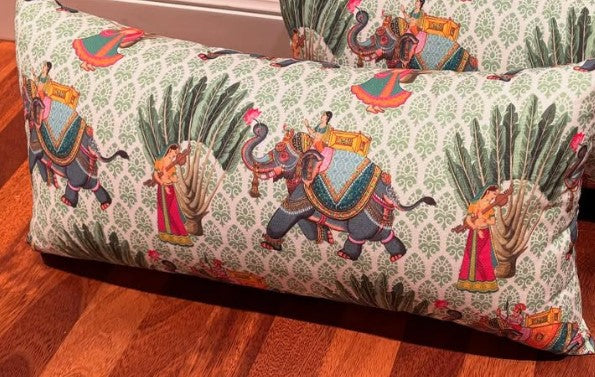 Cojín en tela de elefantes verdes.