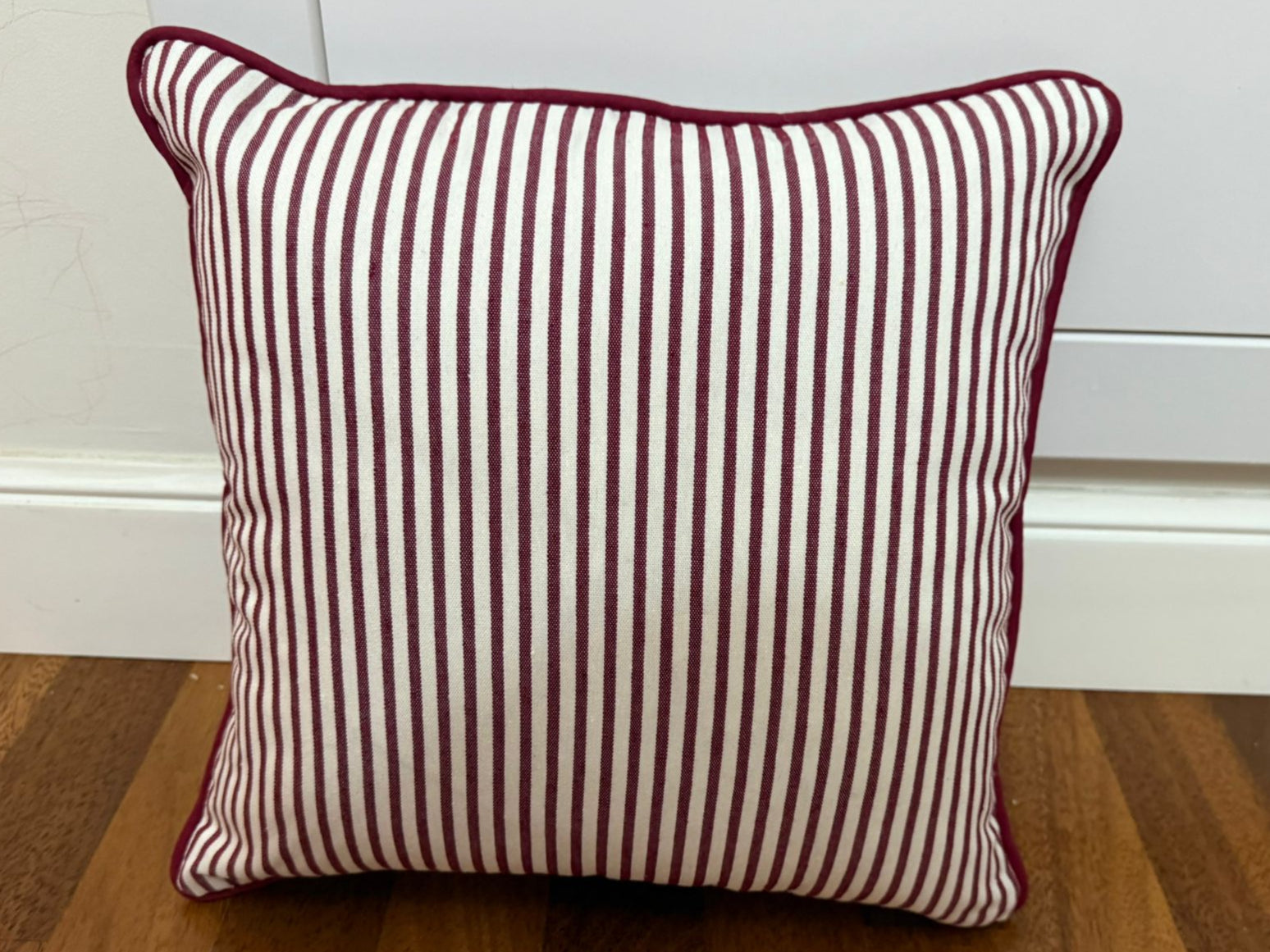 Cojín de tela de rayas finas con ribete del mismo color de la raya.