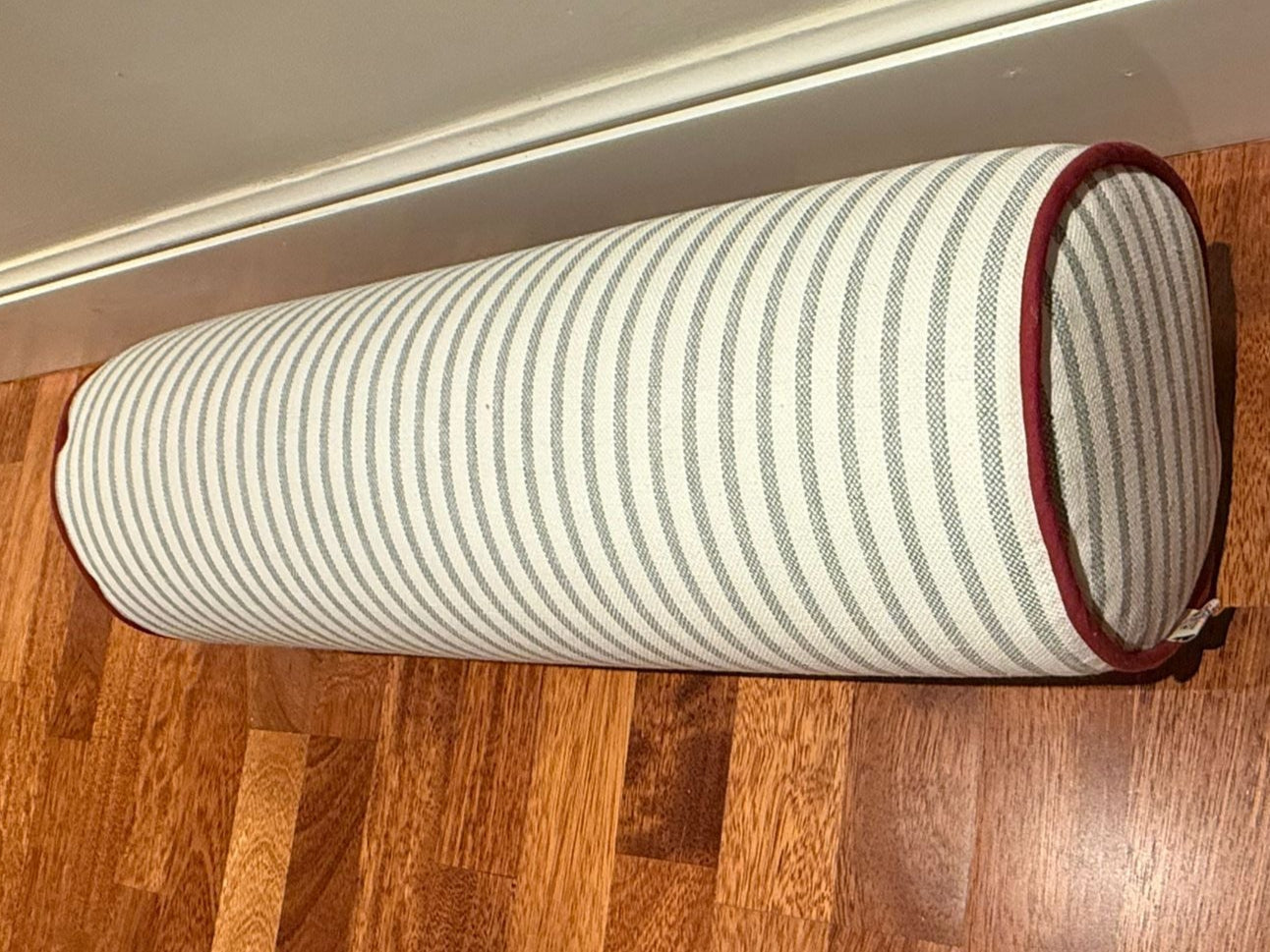 Cojín rulo de rayas gris/azulado con ribete de color.