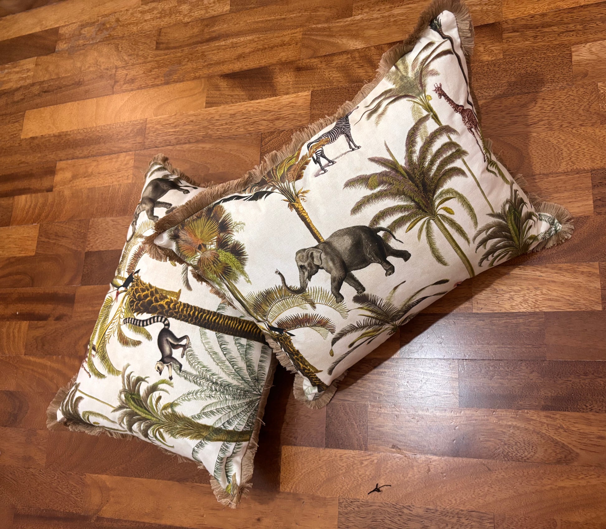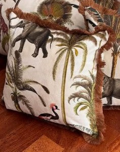 Cojín tela selva con flecos.