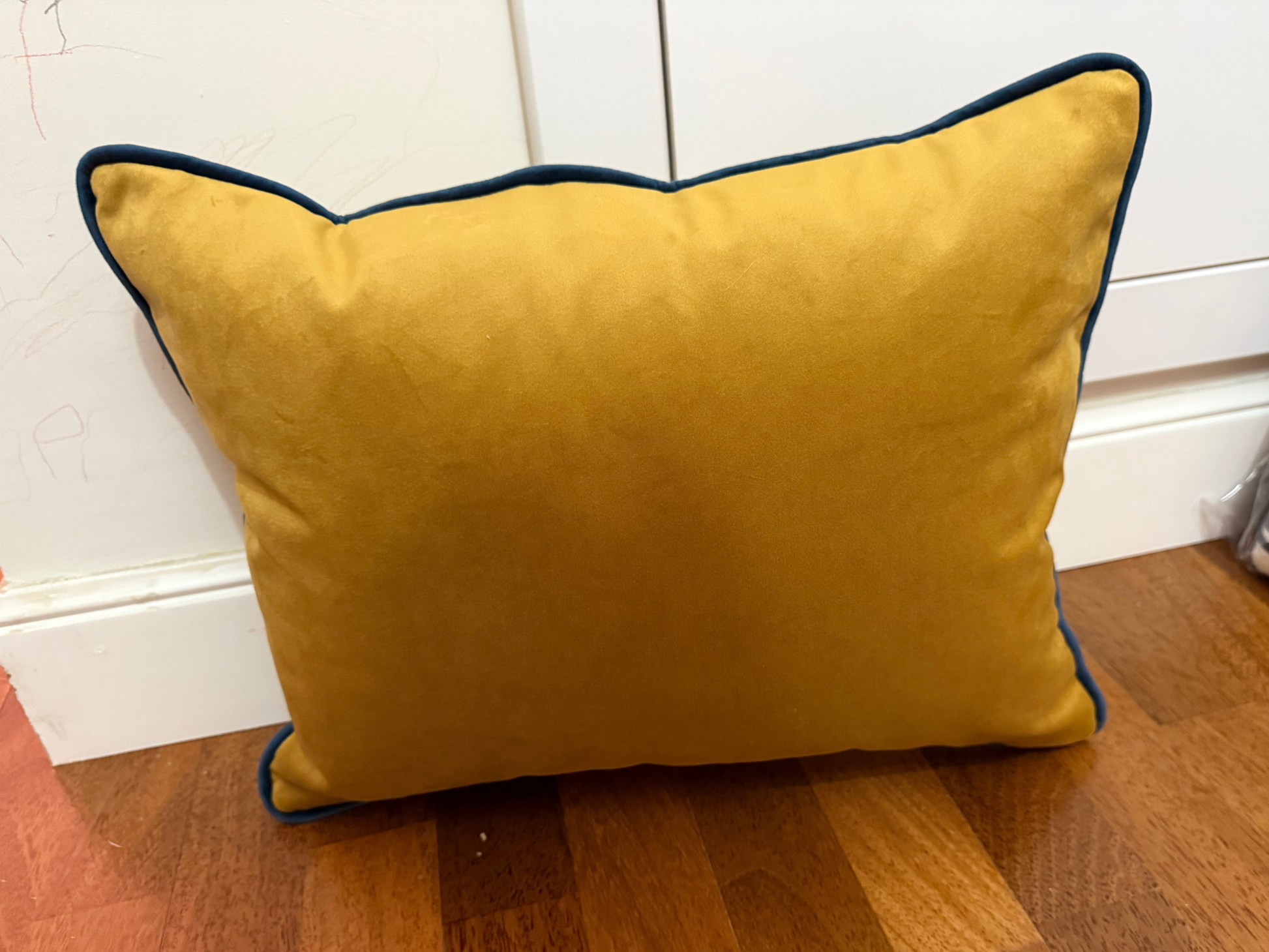 Cojín en tela de terciopelo mostaza con ribete en color azul marino.