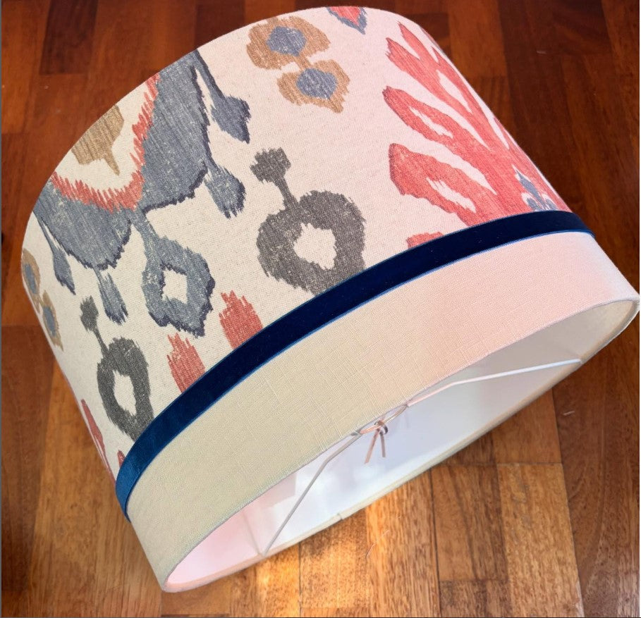 Pantalla tambor de lino beige y tela ikat bali azul con terciopelo.
