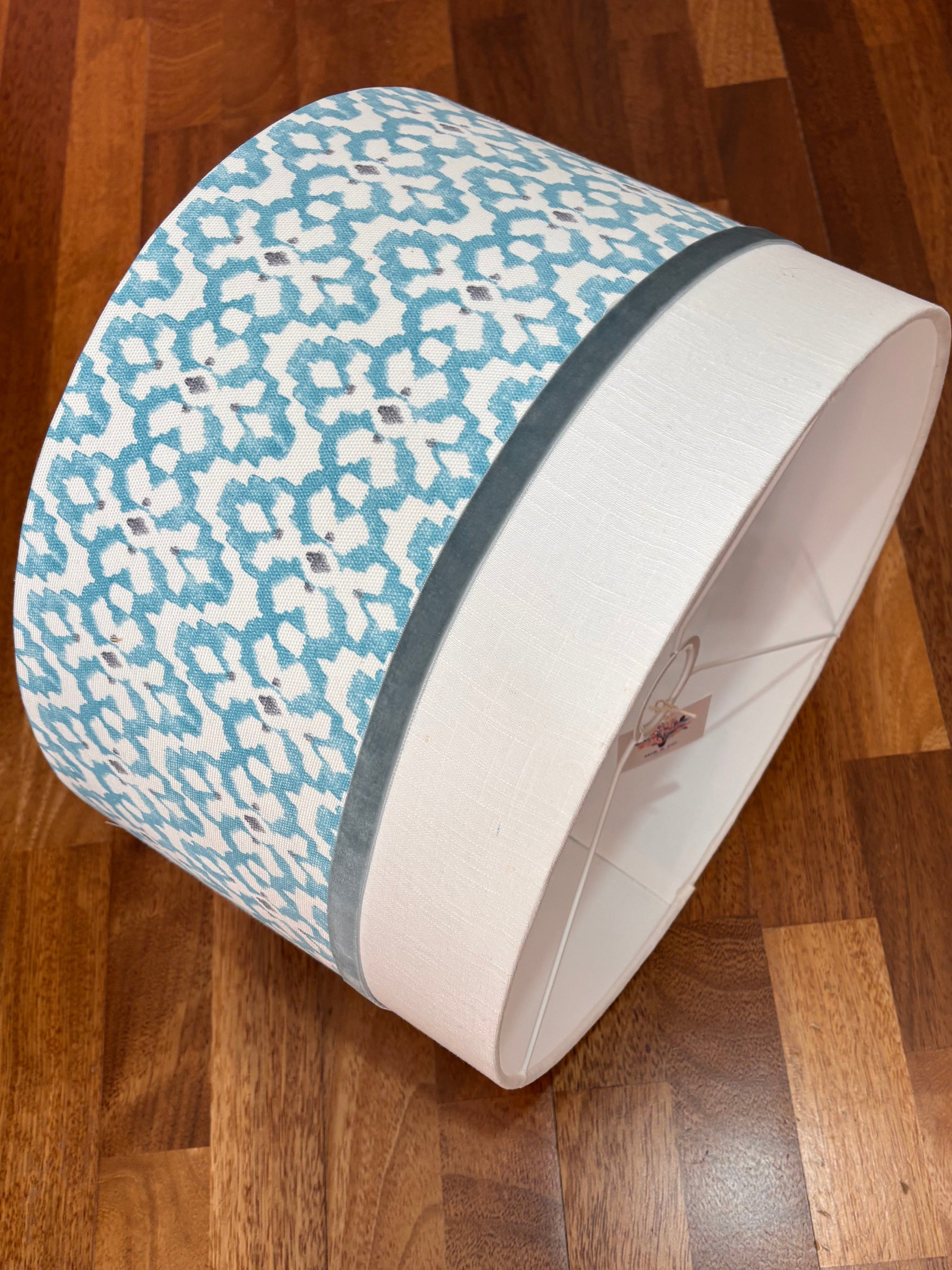 Pantalla tambor combinada en tela de lino blanco, tela Tabatá azul y terciopelo