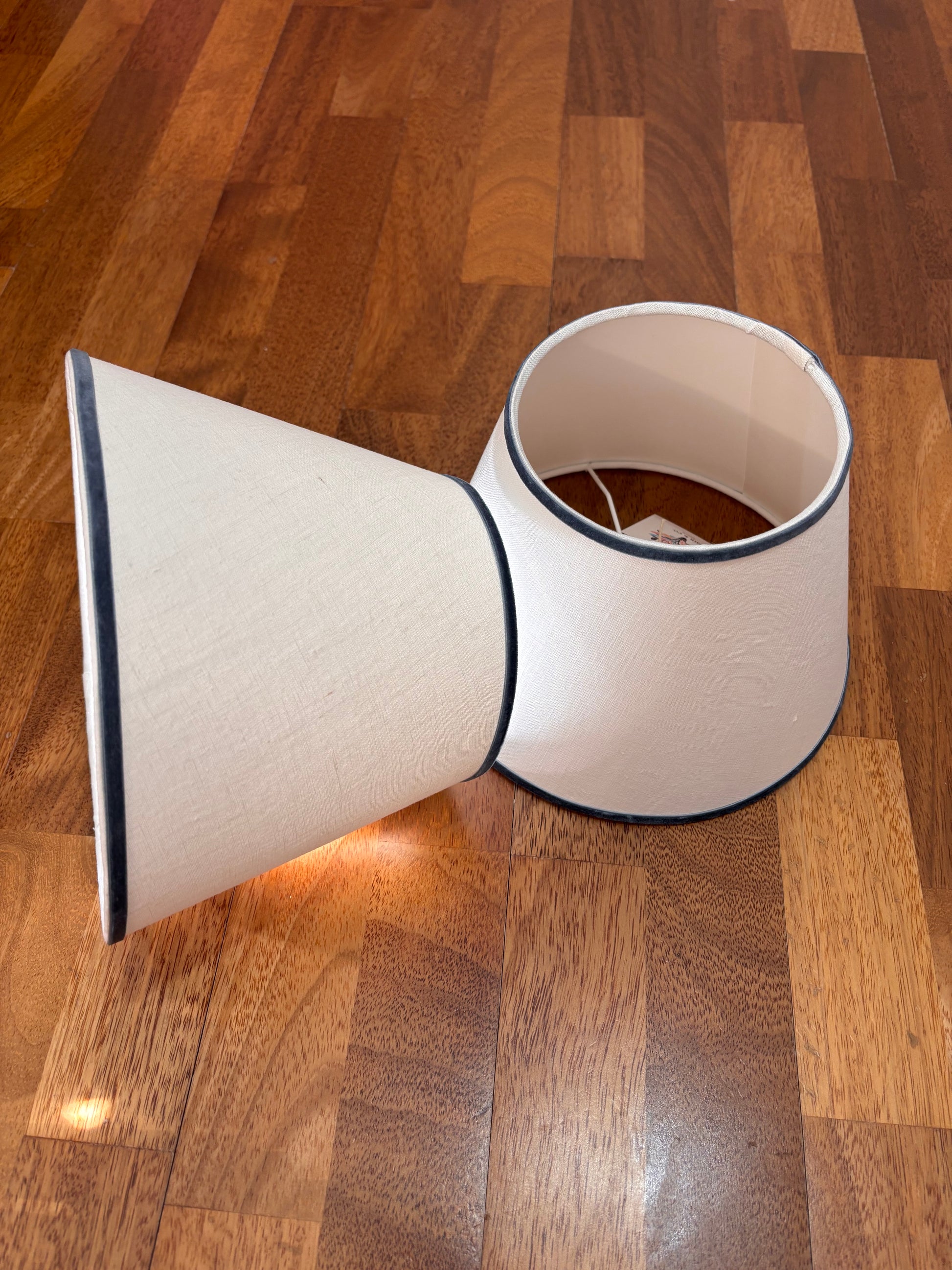 Pantalla cónica en tela de lino blanco con tiras de terciopelo en bordes.
