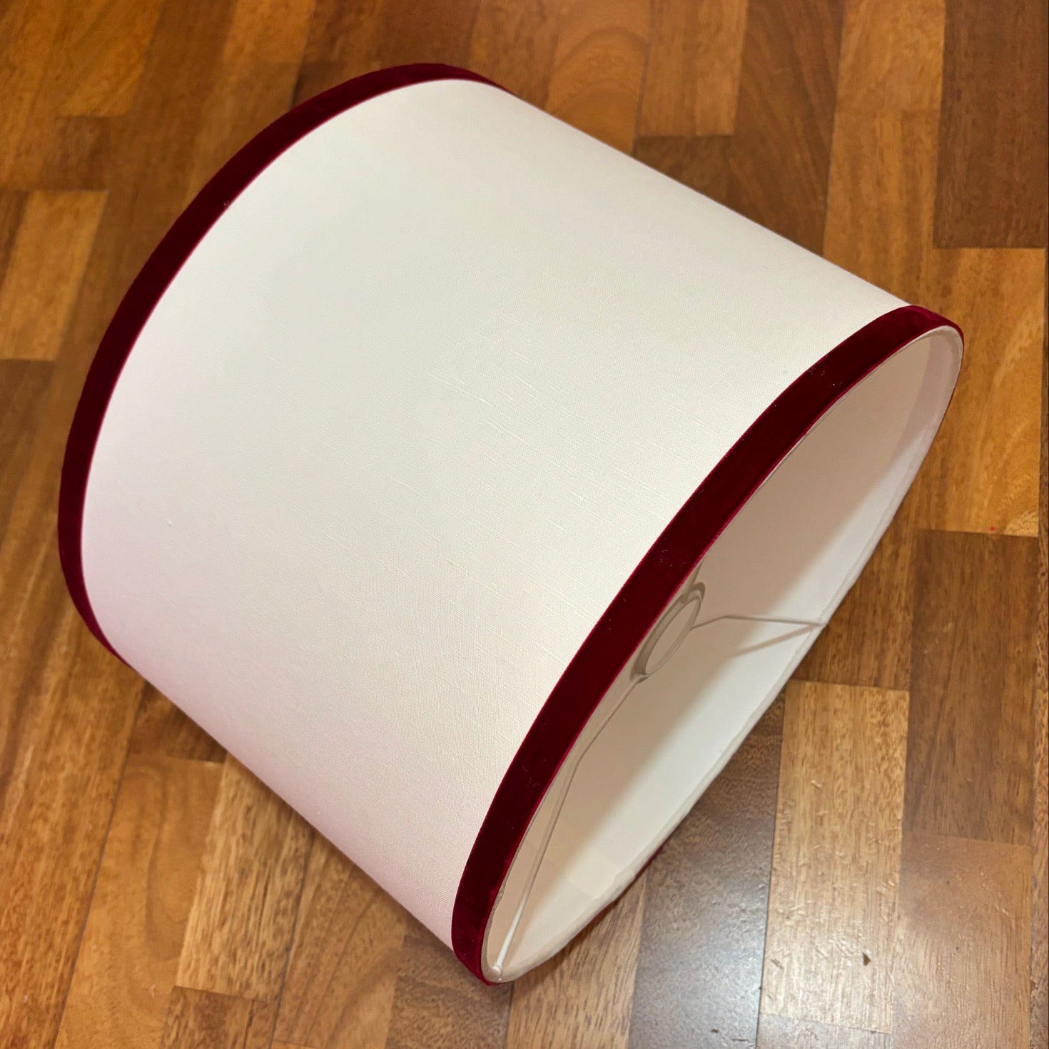 Pantalla tambor en lino blanco con tiras de terciopelo en los bordes.