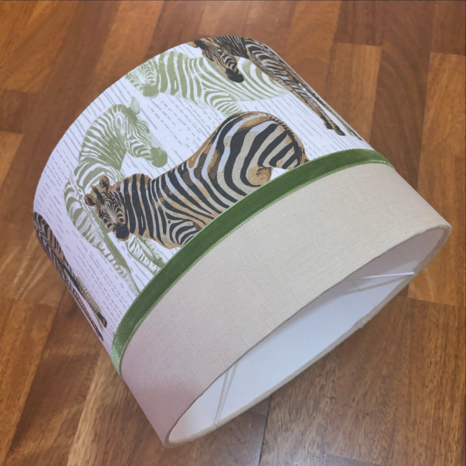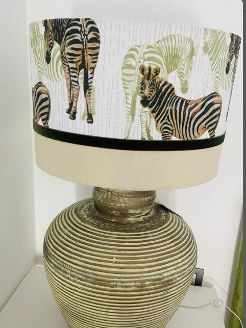 Pantalla tambor en lino beige y tela de cebras con terciopelo.