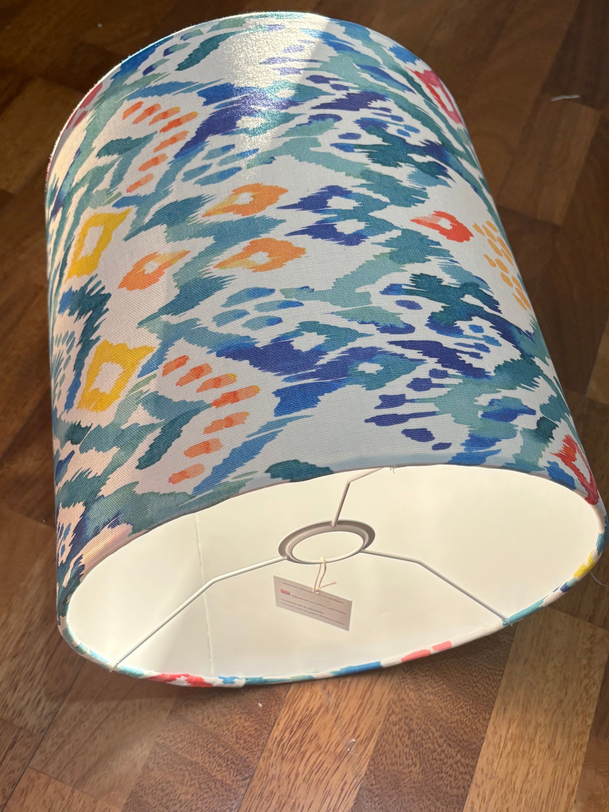 Pantalla tambor de tela mallorquina color turquesa.