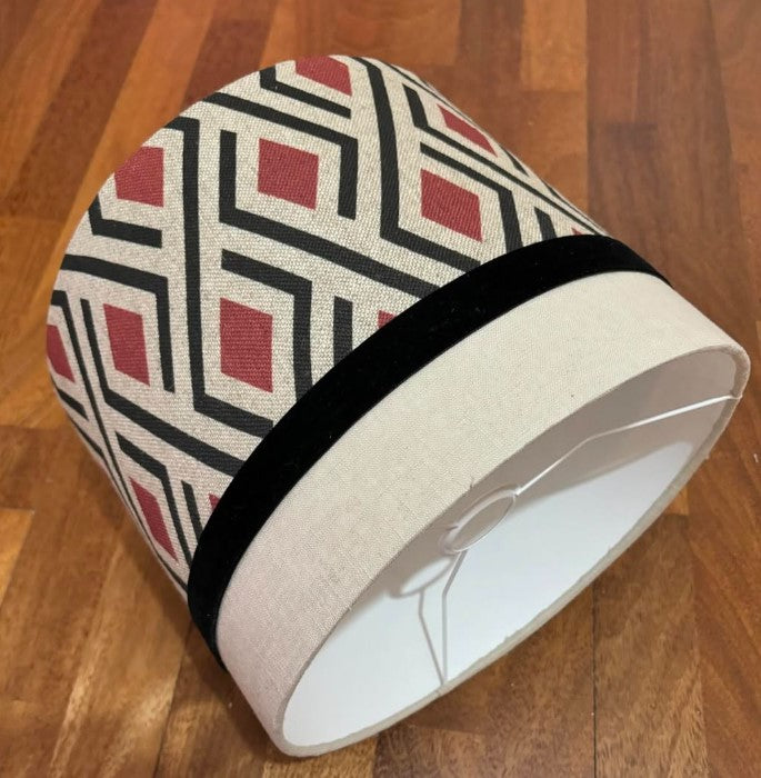 Pantalla tambor en tela de rombos teja con lino beige y terciopelo.