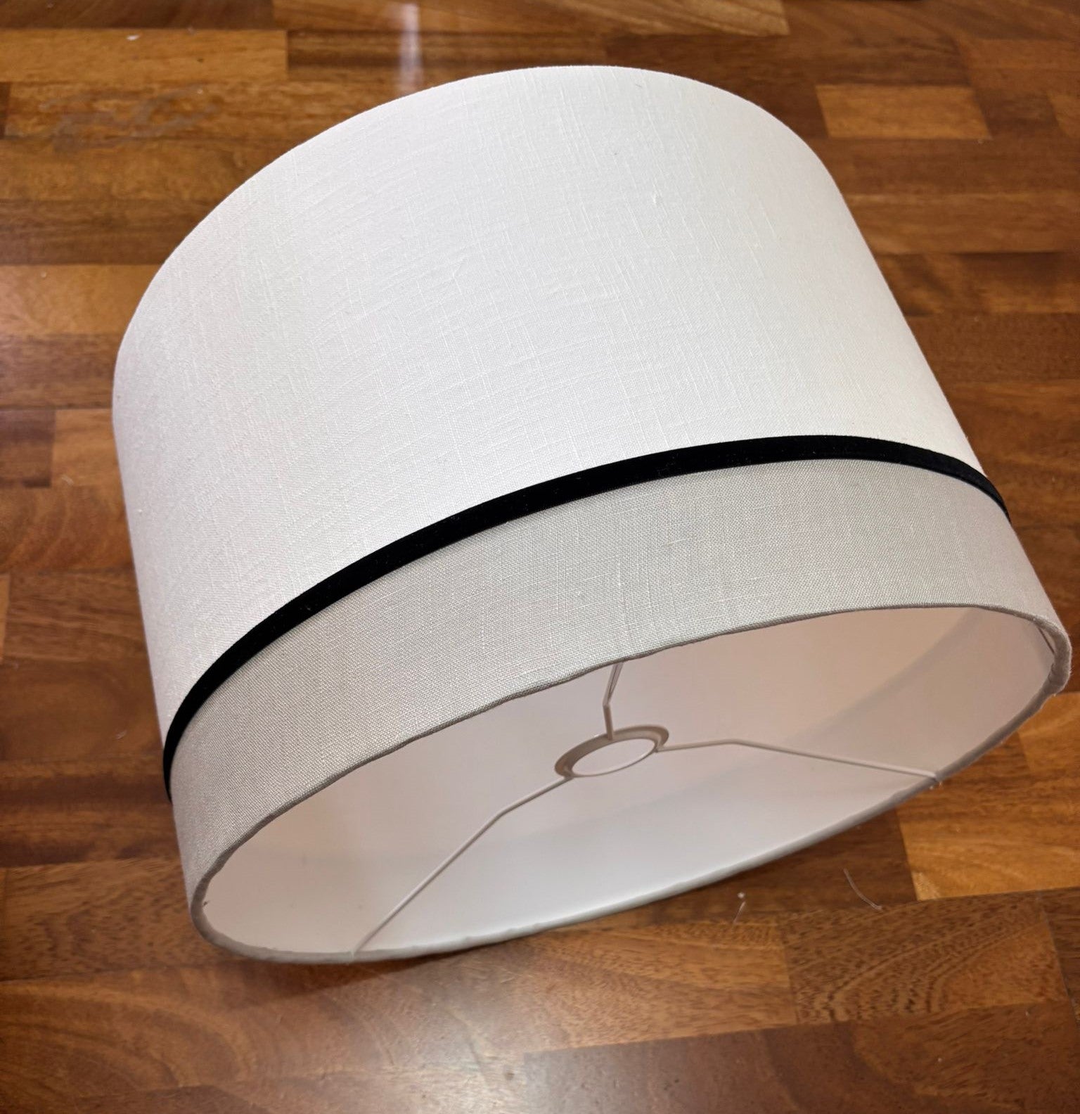 Pantalla tambor en lino blanco y gris con terciopelo negro.