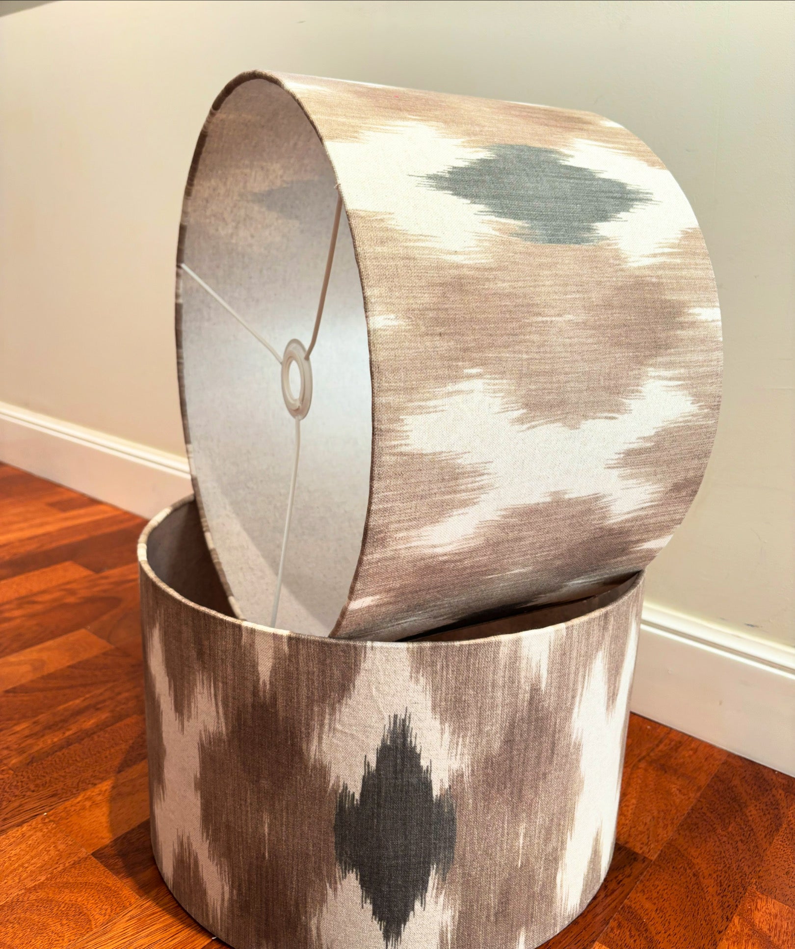 Pantalla tipo tambor en tela de tonos arena y grises.